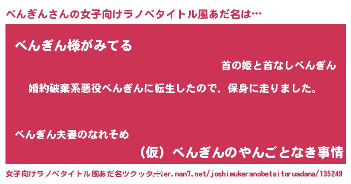 べんぎんさんの女子向けラノベタイトル風あだ名は… 『婚約破棄系悪役べんぎんに転生したので、保身に走りました。』『べんぎん様がみてる』『(仮)べんぎんのやんごとなき事情』 ツクッター #女子向けラノベタイトル風あだ名ツクッター http://tkutter.nan7.net/joshimukeranobetaitoruadana/135249/