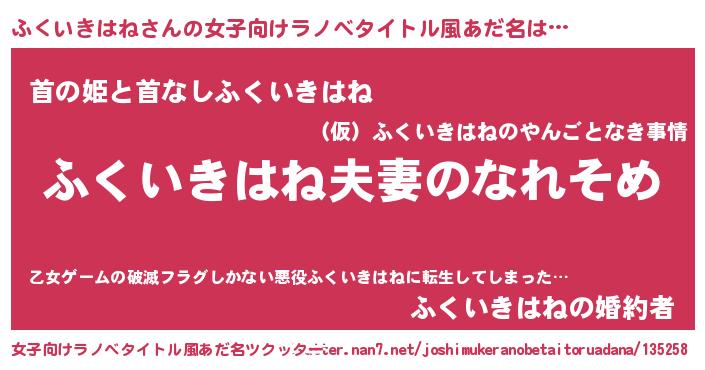 | 男性向けラノベタイトル風あだ名 | 『おまえをオタクにしてやるから、俺をふくいきはねにしてくれ! 』 |