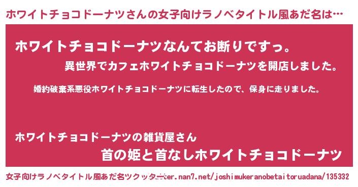 | 男性向けラノベタイトル風あだ名 | 『ホワイトチョコドーナツスレイヤー』 |