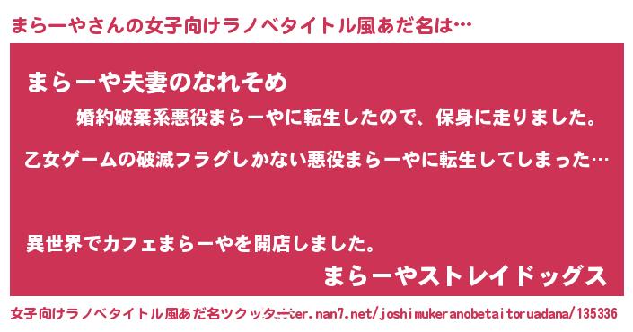 | 男性向けラノベタイトル風あだ名 | 『この素晴らしい世界にまらーやを!』 |