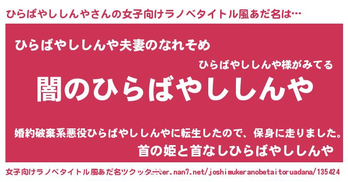 | 男性向けラノベタイトル風あだ名 | 『Re:ひらばやししんやから始める異世界生活』 |