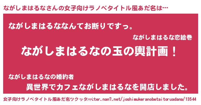 | 男性向けラノベタイトル風あだ名 | 『ながしまはるな~年齢イコール彼女いない歴の魔法使い~』 |