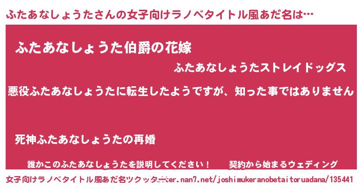 | 男性向けラノベタイトル風あだ名 | 『この素晴らしい世界にふたあなしょうたを!』 |