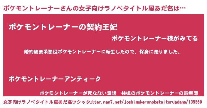 ポケモントレーナーさんの女子向けラノベタイトル風あだ名は… 『婚約破棄系悪役ポケモントレーナーに転生したので、保身に走りました。』『ポケモントレーナーの契約王妃』『ポケモントレーナーが死なない童話 林檎のポケモントレーナーの診療簿』 ツクッター #女子向けラノベタイトル風あだ名ツクッター http://tkutter.nan7.net/joshimukeranobetaitoruadana/135560/