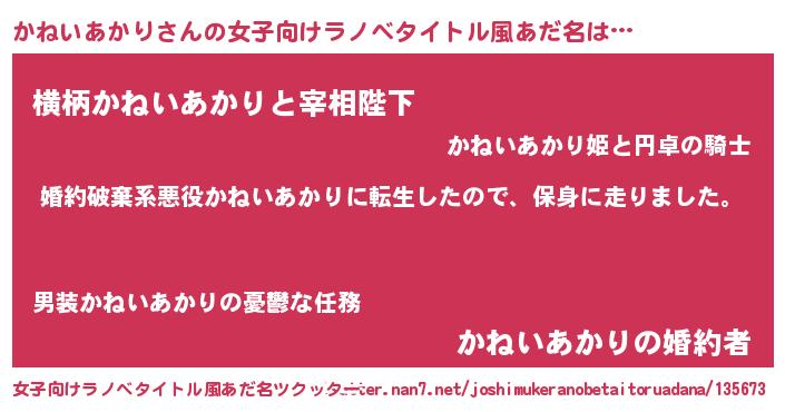 かねいあかりさんの女子向けラノベタイトル風あだ名は… 『婚約破棄系悪役かねいあかりに転生したので、保身に走りました。』『横柄かねいあかりと宰相陛下』『かねいあかりの婚約者』 ツクッター #女子向けラノベタイトル風あだ名ツクッター http://tkutter.nan7.net/joshimukeranobetaitoruadana/135673/