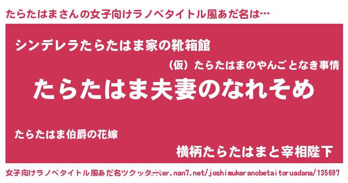 | 男性向けラノベタイトル風あだ名 | 『おまえをオタクにしてやるから、俺をたらたはまにしてくれ! 』 |