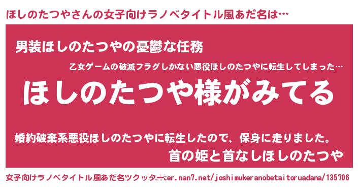 | 男性向けラノベタイトル風あだ名 | 『ほしのたつやの嫁は女の子じゃないと思った?』 |