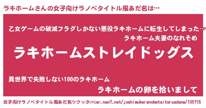 | 男性向けラノベタイトル風あだ名 | 『Re:ラキホームから始める異世界生活』 |
