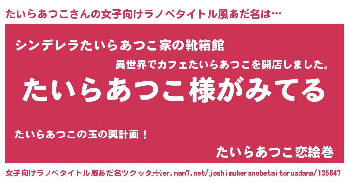 | 男性向けラノベタイトル風あだ名 | 『たいらあつこの嫁は女の子じゃないと思った?』 |