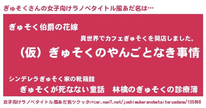 | 男性向けラノベタイトル風あだ名 | 『ぎゅそくの憂鬱』『魔弾の王とぎゅそく』 |