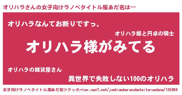 | 男性向けラノベタイトル風あだ名 | 『オリハラの嫁は女の子じゃないと思った?』 |