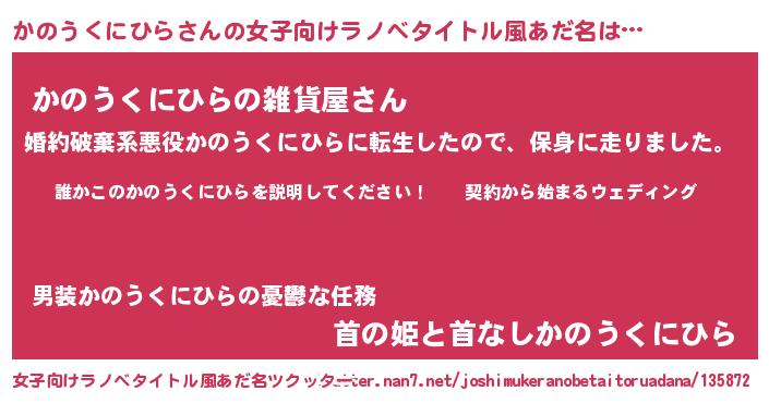 | 男性向けラノベタイトル風あだ名 | 『カノウクニヒラアートオンライン』 |