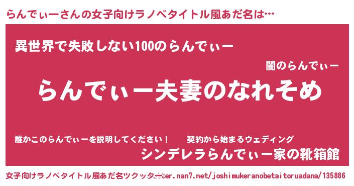 | 男性向けラノベタイトル風あだ名 | 『おまえをオタクにしてやるから、俺をらんでぃーにしてくれ! 』 |