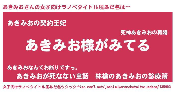 | 男性向けラノベタイトル風あだ名 | 『あきみおの嫁は女の子じゃないと思った?』 |