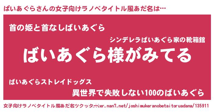 | 男性向けラノベタイトル風あだ名 | 『ばいあぐらの嫁は女の子じゃないと思った?』 |
