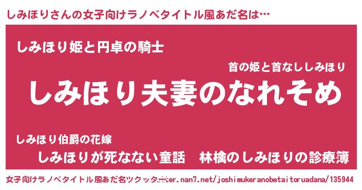 | 男性向けラノベタイトル風あだ名 | 『おまえをオタクにしてやるから、俺をしみほりにしてくれ! 』 |