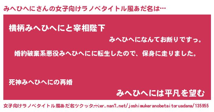 | 男性向けラノベタイトル風あだ名 | 『転生したらみへひへにだった件』 |