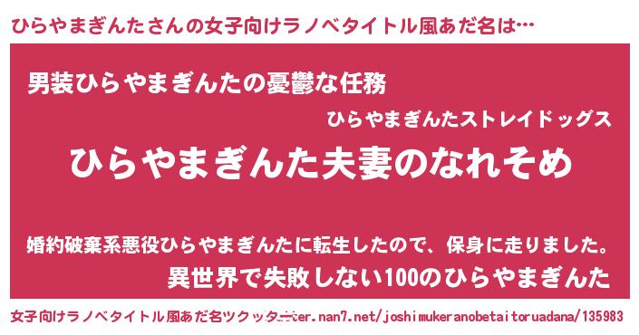 | 男性向けラノベタイトル風あだ名 | 『おまえをオタクにしてやるから、俺をひらやまぎんたにしてくれ! 』 |