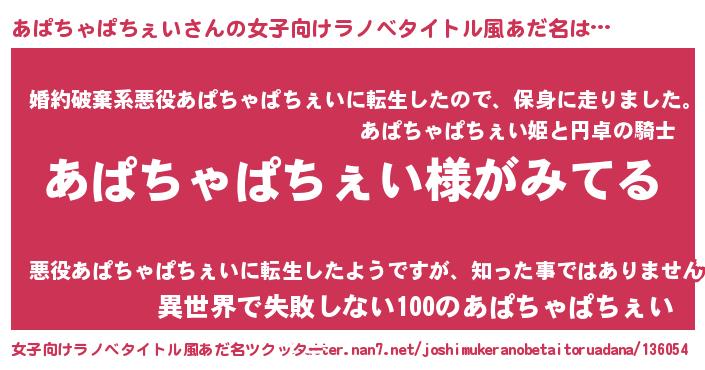 | 男性向けラノベタイトル風あだ名 | 『あぱちゃぱちぇいの嫁は女の子じゃないと思った?』 |