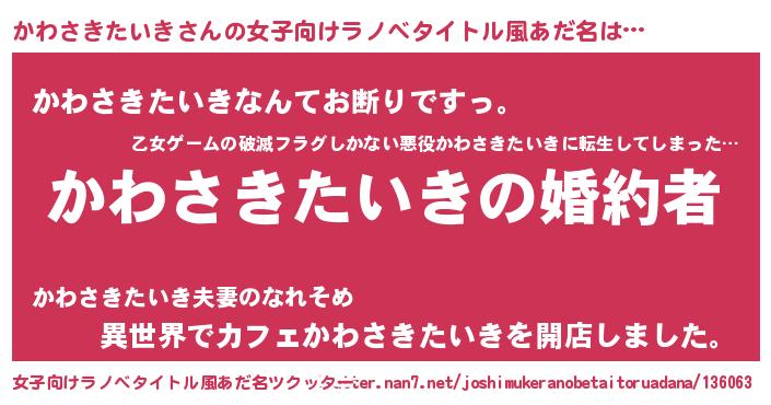 | 男性向けラノベタイトル風あだ名 | 『うちの娘の為ならば、俺はもしかしたらかわさきたいきも倒せるかもしれない。』 |