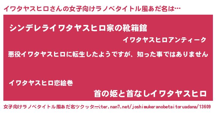 | 胡散臭い通販商品みたいなあだ名 | 『あなたにだけ特別に提供する100年もののヴィンテージワイン…その名も「イワタヤスヒロ」』 |
