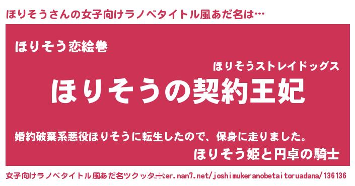 | 男性向けラノベタイトル風あだ名 | 『ほりそうという概念が存在しない退屈な世界 』 |