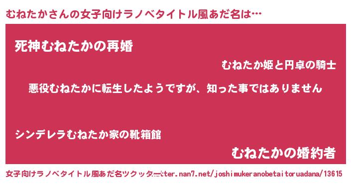 | 男性向けラノベタイトル風あだ名 | 『この素晴らしい世界にむねたかを!』 |