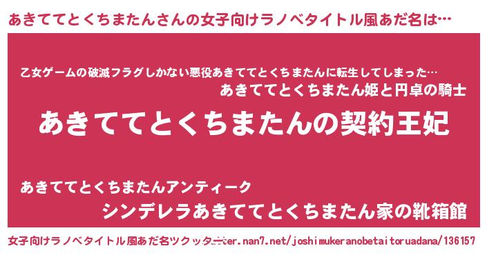 | 男性向けラノベタイトル風あだ名 | 『あきててとくちまたんという概念が存在しない退屈な世界 』 |