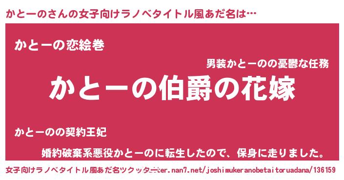 | 男性向けラノベタイトル風あだ名 | 『うちの娘の為ならば、俺はもしかしたらかとーのも倒せるかもしれない。』 |