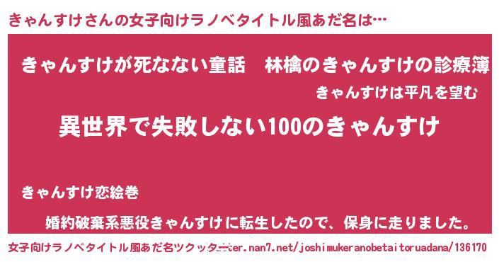 | 男性向けラノベタイトル風あだ名 | 『きゃんすけという概念が存在しない退屈な世界 』 |