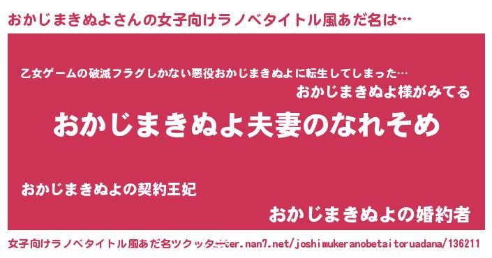 | 男性向けラノベタイトル風あだ名 | 『おまえをオタクにしてやるから、俺をおかじまきぬよにしてくれ! 』 |