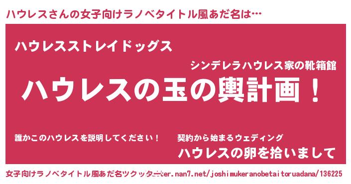| 男性向けラノベタイトル風あだ名 | 『ハウレス~年齢イコール彼女いない歴の魔法使い~』 |