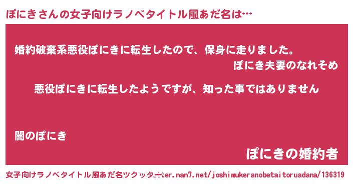 | 男性向けラノベタイトル風あだ名 | 『この素晴らしい世界にぽにきを!』 |