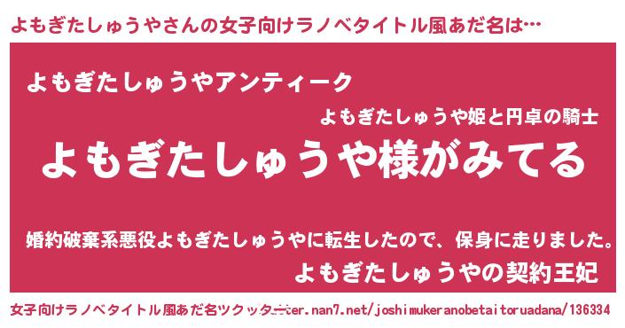 | 男性向けラノベタイトル風あだ名 | 『よもぎたしゅうやの嫁は女の子じゃないと思った?』 |
