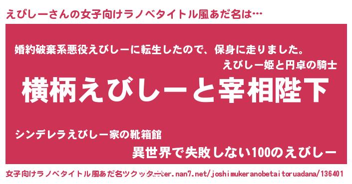 | 男性向けラノベタイトル風あだ名 | 『えびしーに滅ぼされるだけの簡単なお仕事です』 |