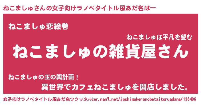 ねこましゅさんの女子向けラノベタイトル風あだ名は… 『ねこましゅの雑貨屋さん』『ねこましゅ恋絵巻』『異世界でカフェねこましゅを開店しました。』 ツクッター #女子向けラノベタイトル風あだ名ツクッター http://tkutter.nan7.net/joshimukeranobetaitoruadana/136406/