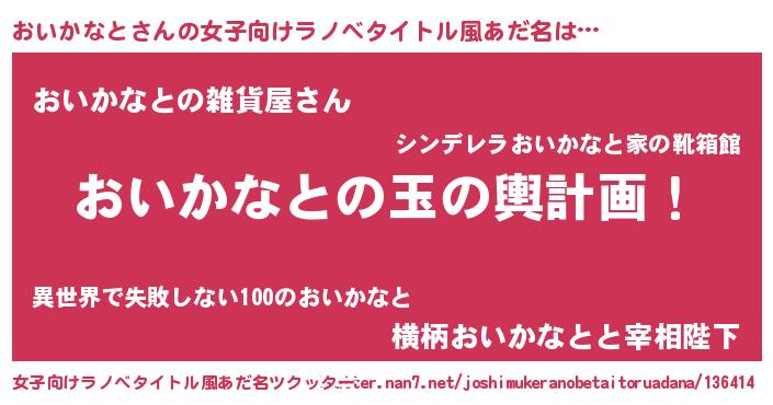 | 男性向けラノベタイトル風あだ名 | 『おいかなと~年齢イコール彼女いない歴の魔法使い~』 |