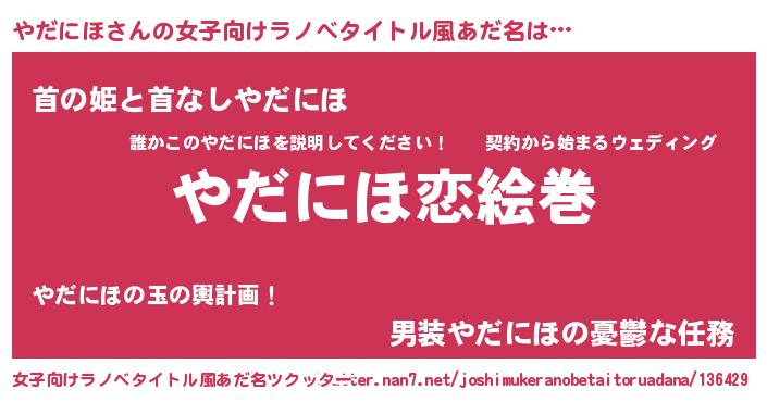 | 男性向けラノベタイトル風あだ名 | 『おまえをオタクにしてやるから、俺をやだにほにしてくれ! 』 |