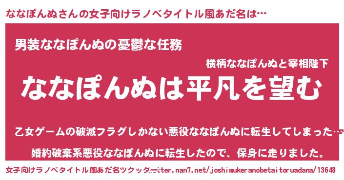 | 胡散臭い通販商品みたいなあだ名 | 『信頼と実績のサプリメント…その名も「ななぽんぬ」』 |