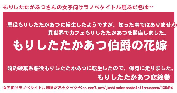 | 男性向けラノベタイトル風あだ名 | 『うちの娘の為ならば、俺はもしかしたらもりしたたかあつも倒せるかもしれない。』 |