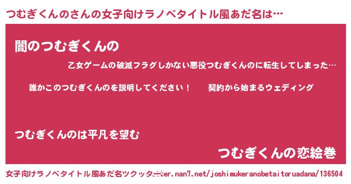 つむぎくんのさんの女子向けラノベタイトル風あだ名は… 『誰かこのつむぎくんのを説明してください! ~契約から始まるウェディング~』『闇のつむぎくんの』『つむぎくんの恋絵巻』 ツクッター #女子向けラノベタイトル風あだ名ツクッター http://tkutter.nan7.net/joshimukeranobetaitoruadana/136504/