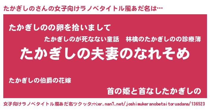 | 男性向けラノベタイトル風あだ名 | 『おまえをオタクにしてやるから、俺をたかぎしのにしてくれ! 』 |