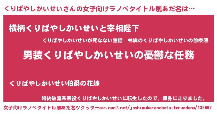| 男性向けラノベタイトル風あだ名 | 『うちのくりばやしかいせいが世界を掌握している!』 |