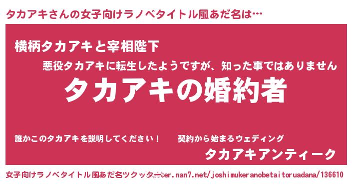 | 男性向けラノベタイトル風あだ名 | 『うちの娘の為ならば、俺はもしかしたらタカアキも倒せるかもしれない。』 |