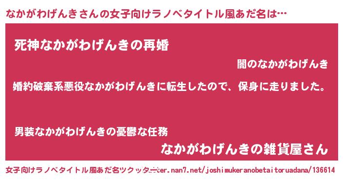なかがわげんきさんの女子向けラノベタイトル風あだ名は… 『婚約破棄系悪役なかがわげんきに転生したので、保身に走りました。』『死神なかがわげんきの再婚』『なかがわげんきの雑貨屋さん』 ツクッター #女子向けラノベタイトル風あだ名ツクッター http://tkutter.nan7.net/joshimukeranobetaitoruadana/136614/