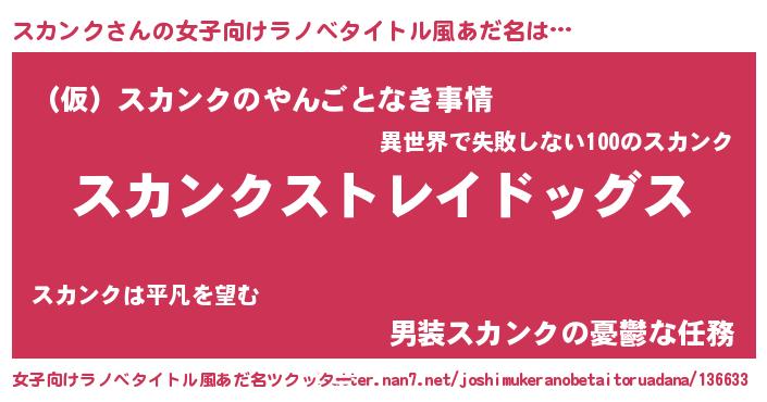 | 男性向けラノベタイトル風あだ名 | 『Re:スカンクから始める異世界生活』 |