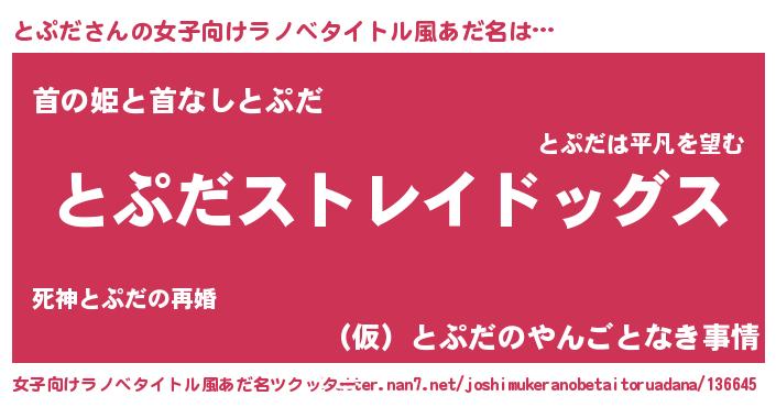 | 男性向けラノベタイトル風あだ名 | 『Re:とぷだから始める異世界生活』 |