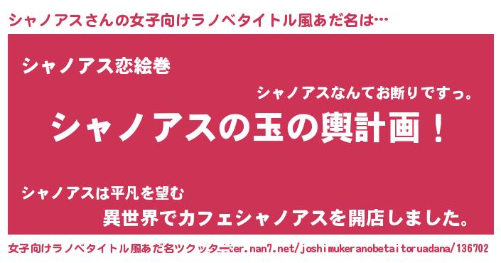 | 男性向けラノベタイトル風あだ名 | 『シャノアス~年齢イコール彼女いない歴の魔法使い~』 |