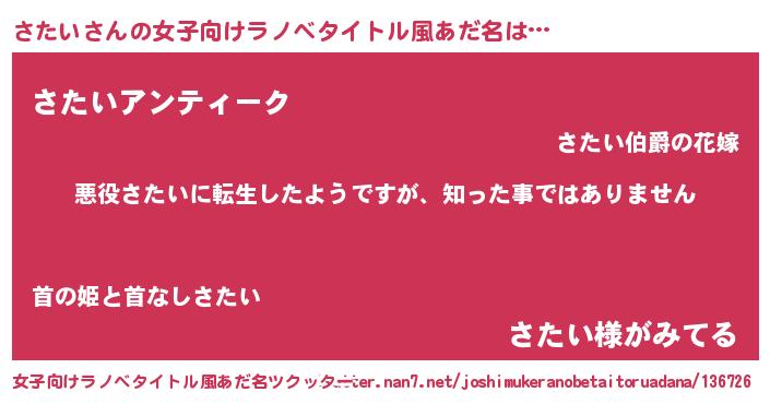 | 男性向けラノベタイトル風あだ名 | 『この素晴らしい世界にさたいを!』 |