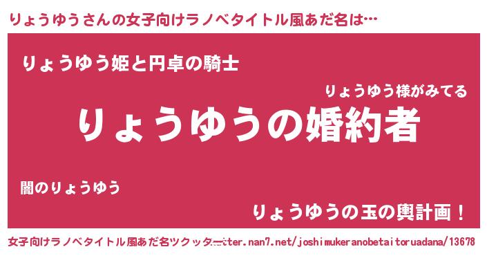 りょうゆうさんの女子向けラノベタイトル風あだ名は… 『りょうゆうの婚約者』『りょうゆう姫と円卓の騎士』『りょうゆうの玉の輿計画!』 ツクッター #女子向けラノベタイトル風あだ名ツクッター http://tkutter.nan7.net/joshimukeranobetaitoruadana/13678/
